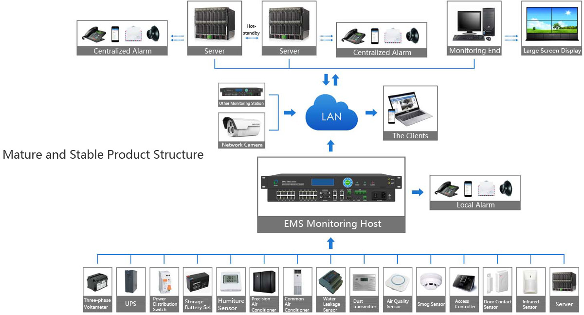 The integrated monitoring for the environment, power, security, fire, video, and network in the computer room can be done by our system. When the monitoring is connected to the networked room, the operating data of all the equipment rooms can be aggregated to the monitoring center through the EMVIEW networking platform. The monitoring center uniformly supervises the operating status of each equipment room. If something wrong happen, the monitoring center can check the cause of the malfunction promptly and assign the corresponding personnel to handle the hidden danger of the equipment room.