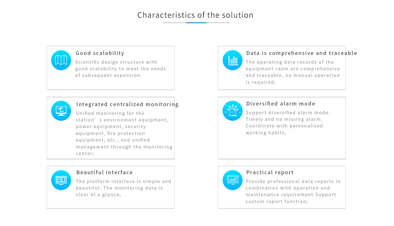 Unified monitoring for the station’s environment equipment, power equipment, security equipment, fire protection equipment, etc., and unified management through the monitoring center;