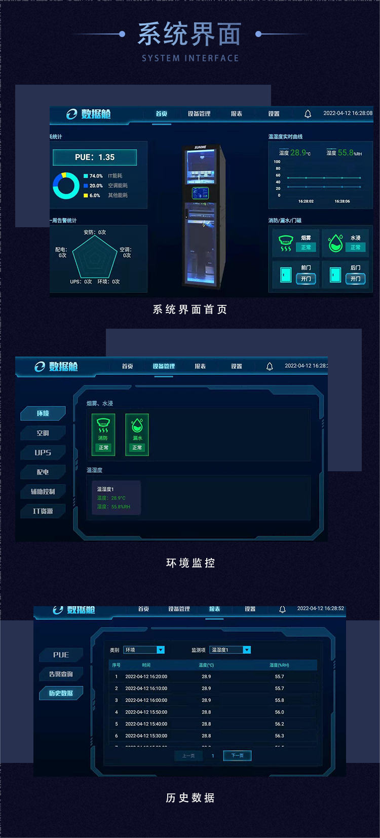 數據艙采用了嚴格的動環監控系統,包括煙霧監控、溫濕度監控、空調監控、視頻監控(選配)等,24小時保護IT設備安全。